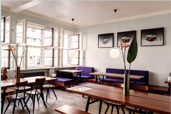 At his deli in the Jüdische Mädchenschule, Paul Mogg brings classic New York food culture to Berlin: Homemade meat delicacies like pastrami and barbecued brisket; from early in the morning until late at night; whether as a grilled sandwich or served cold with salad. Offers range from coffee and homemade desserts to matseball soup and daily specials, to delicatessen products such as kosher salt or wine from the Pauly Saal. The decor is reminiscent of American delis during the 1930s, combined with European design classics and fabrics by Kwadrat. In addition to serving the guests at the Pauly Bar, a catering service is also offered.